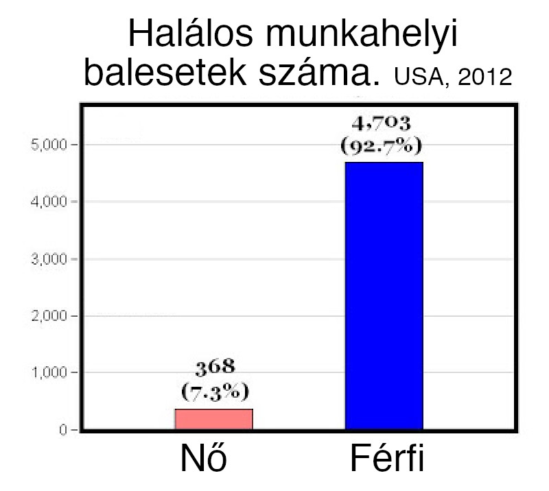 Nagyon szépen megkonstruált mondat, a feministák kedvenc taktikáját, a “paraméter-kiragadás” technikáját alkalmazza. Alapvetően a munkahelyi balesetek 93%-át férfiak szenvedik el. (forrás) Viszont, ha veszünk egy jól specifikált paramétert, a munkaeszközök méret eltérése által okozott balesetek számát ott már a nők vezetnek. Így kell hergelni a közvéleményt.